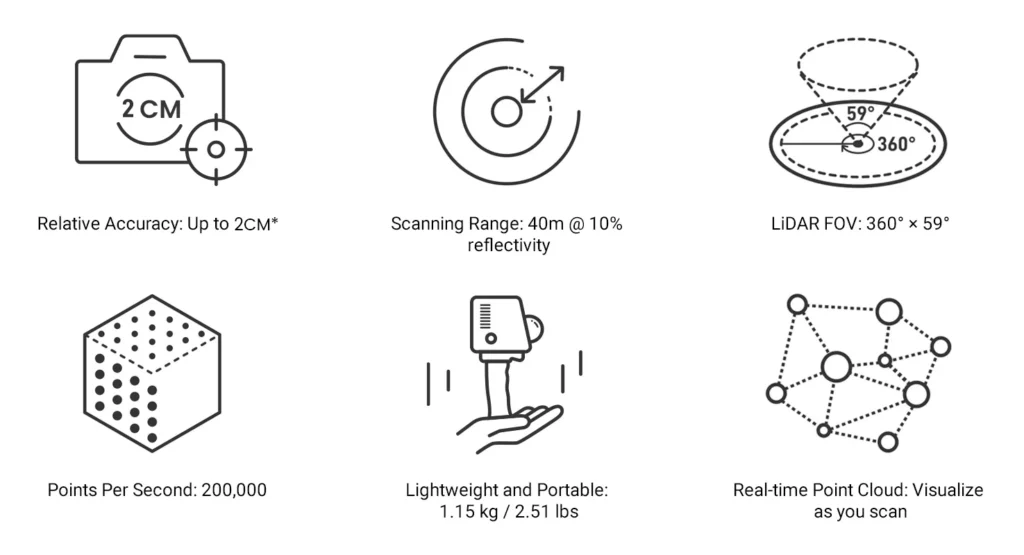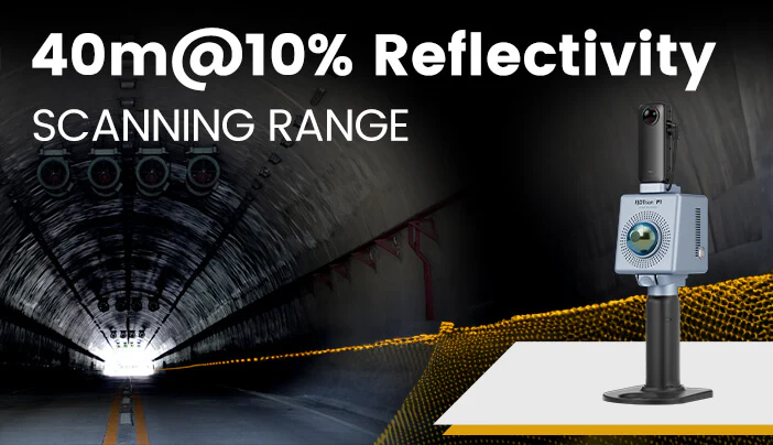 A1: Up to 2mm relative accuracy at a scanning distance of 1m to 40m. Data may be compromised with farther scans, and it is recommended that the scanner is at least 1m away from any object during a scan. It is 40m @10% reflectivity, 70m @80% reflectivity.